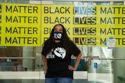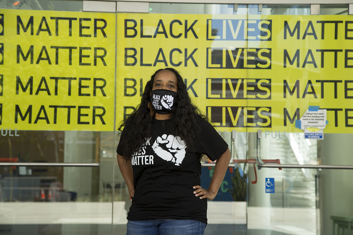 Ericka Scott, an art curator and fellow at the Yerba Buena Center for the Arts, sits outside the center on Tuesday, June 30, 2020. (Kevin N. Hume/S.F. Examiner)