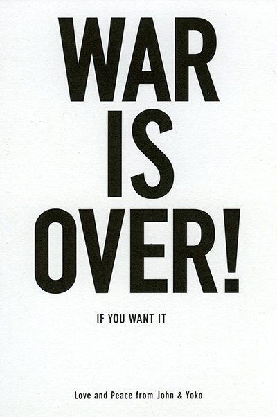Every day I look at a framed poster on my office wall, its message of love and peace beaming down, from John and Yoko. The poster was a gift from a beloved friend who I haven’t seen in quite some time – I wish the circumstances weren’t so. “War is over if you want it.”